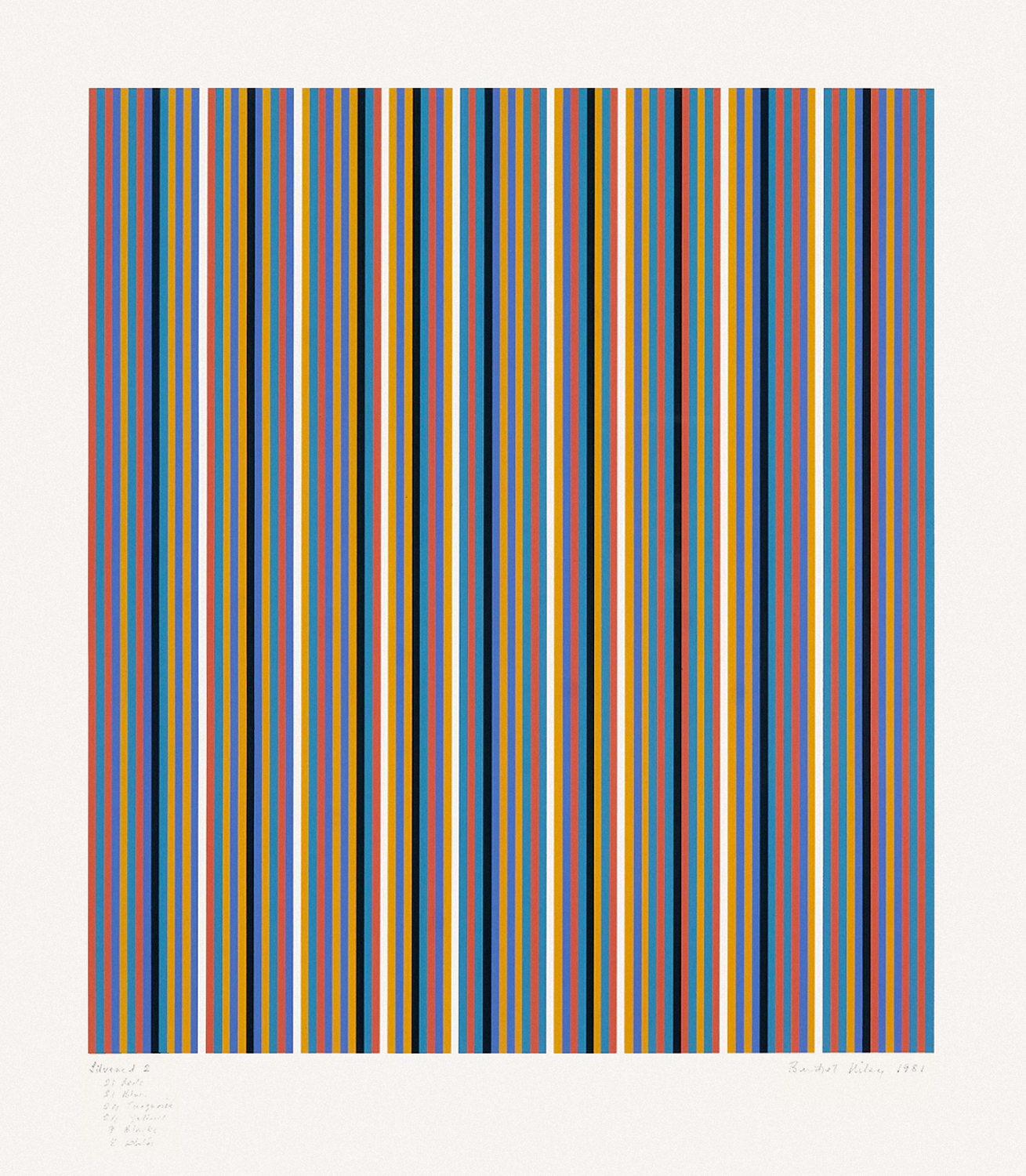 She turned to colour in 1966 after being influenced by Egyptian hieroglyphs and their use of opposing colors. By this time she had attracted widespread attention (one of her paintings was used for the cover to the catalogue of the exhibition ‘The Responsive Eye’ at the Museum of Modern Art, New York, in 1965, the exhibition that put Op Art on the map), and the seal was set on her reputation when she won the International Painting Prize at the Venice Biennale in 1968. Her recent work reflects an engagement with specific historical, religious, and cultural symbols.